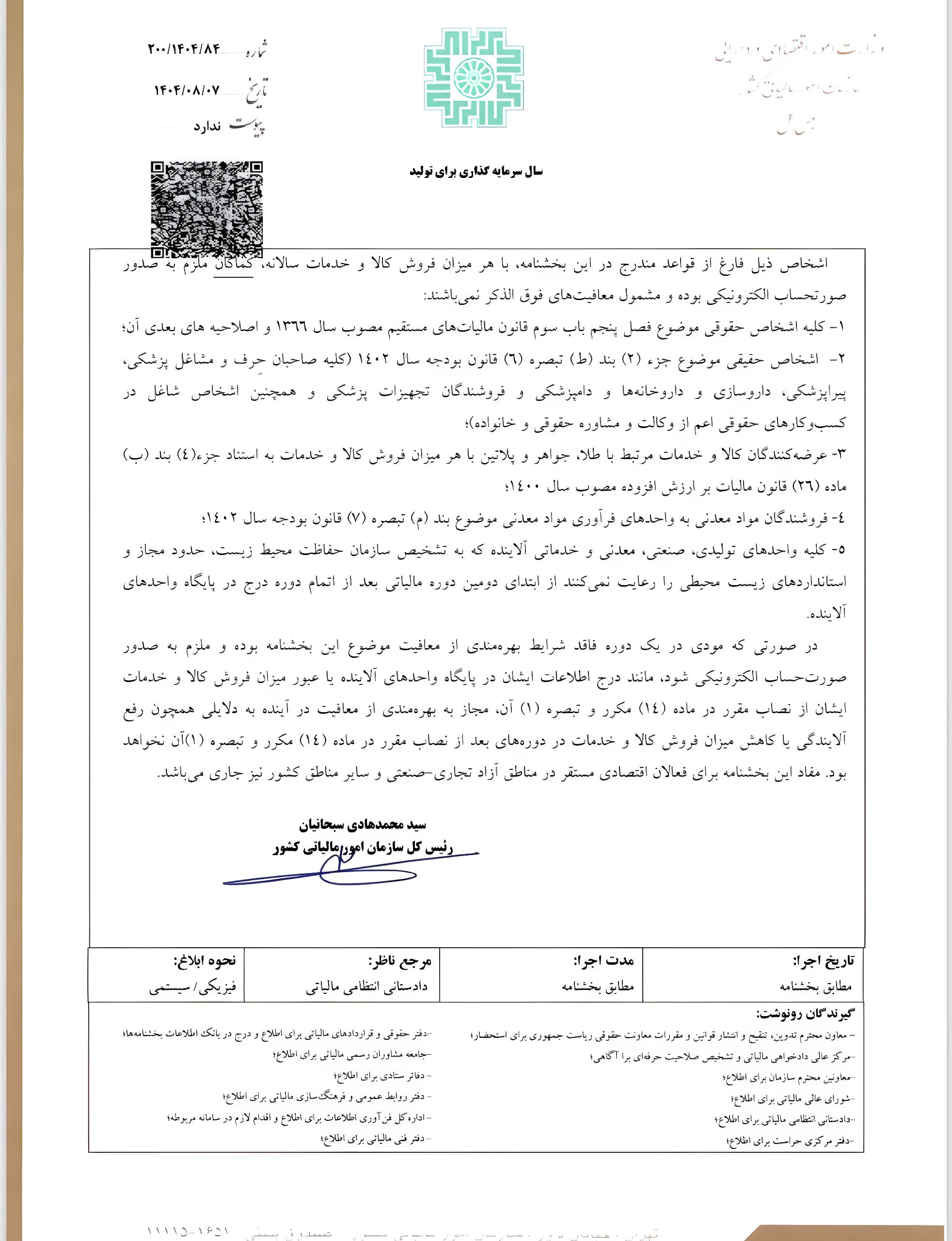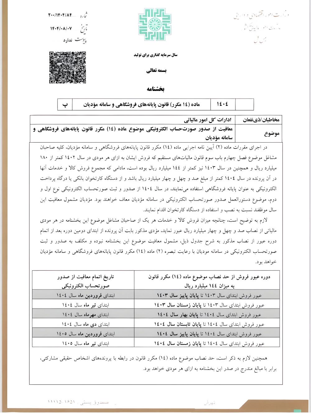 طبق بخشنامه شماره ۸۴/۱۴۰۴/۲۰۰ مورخ 07/08/1404 و در اجرای ماده (۱۴) مکرر قانون پایانههای فروشگاهی و سامانه مؤدیان، نحوه معافیت برخی اشخاص حقیقی و حقوقی از صدور صورتحساب الکترونیکی و نیز زمانبندی اجرای تدریجی قانون اعلام شد.