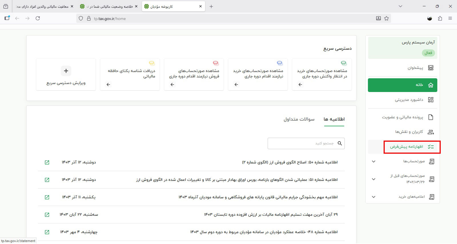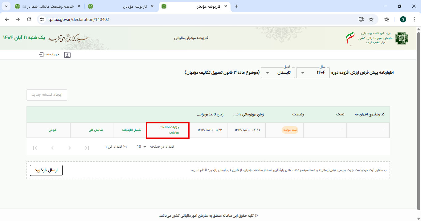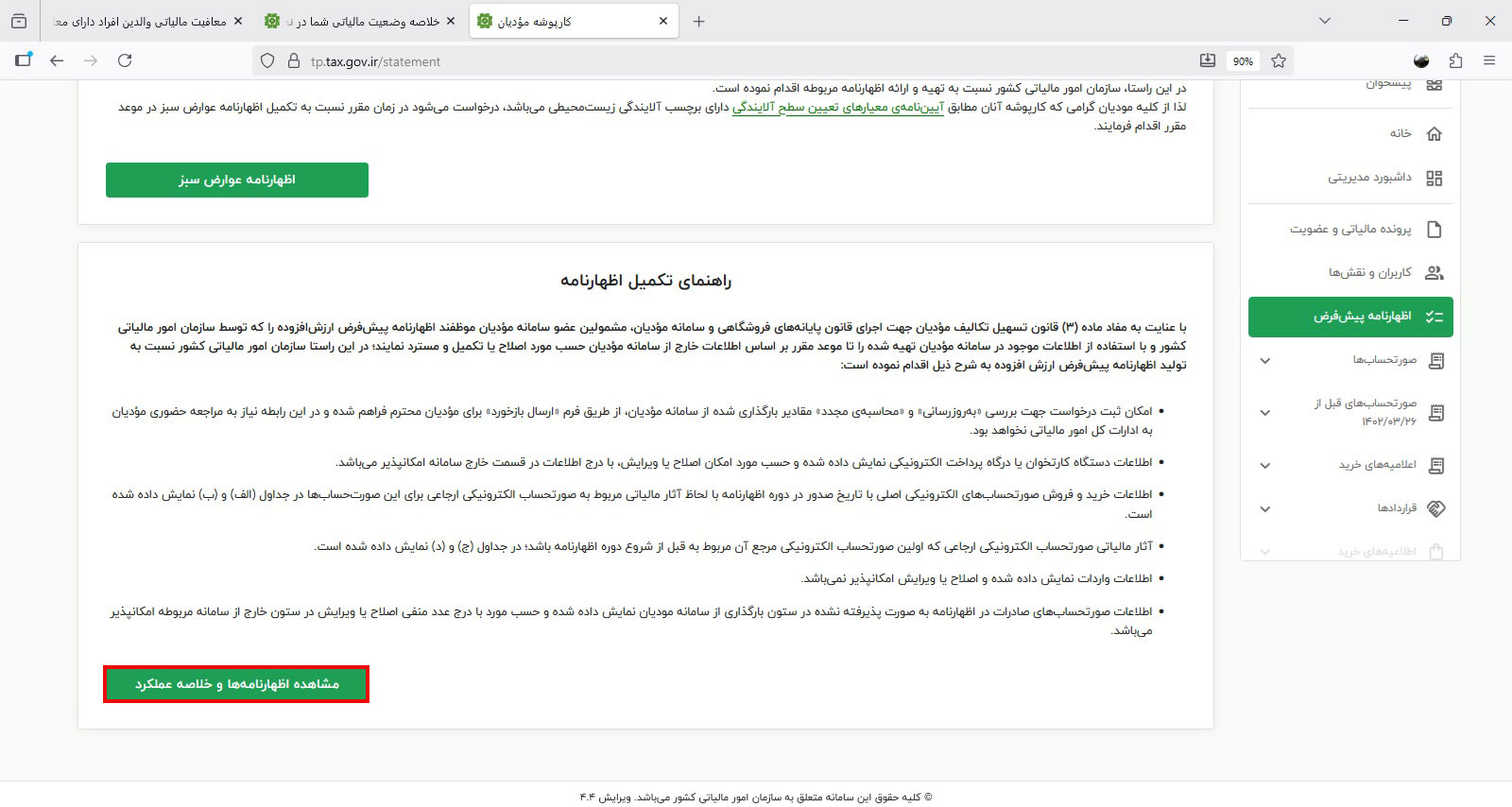 مرحله 3: مشاهده اظهارنامهها و خلاصه عملکرد