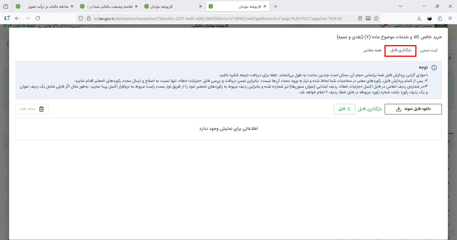 • در آخرین مرحله، فایل نمونه را دانلود نموده و مطابق دستورالعمل، اطلاعات مورد نیاز را تکمیل و ذخیره نمایید. سپس با استفاده از گزینه "بارگذاری فایل"، فایل ذخیره شده را بارگذاری کنید.