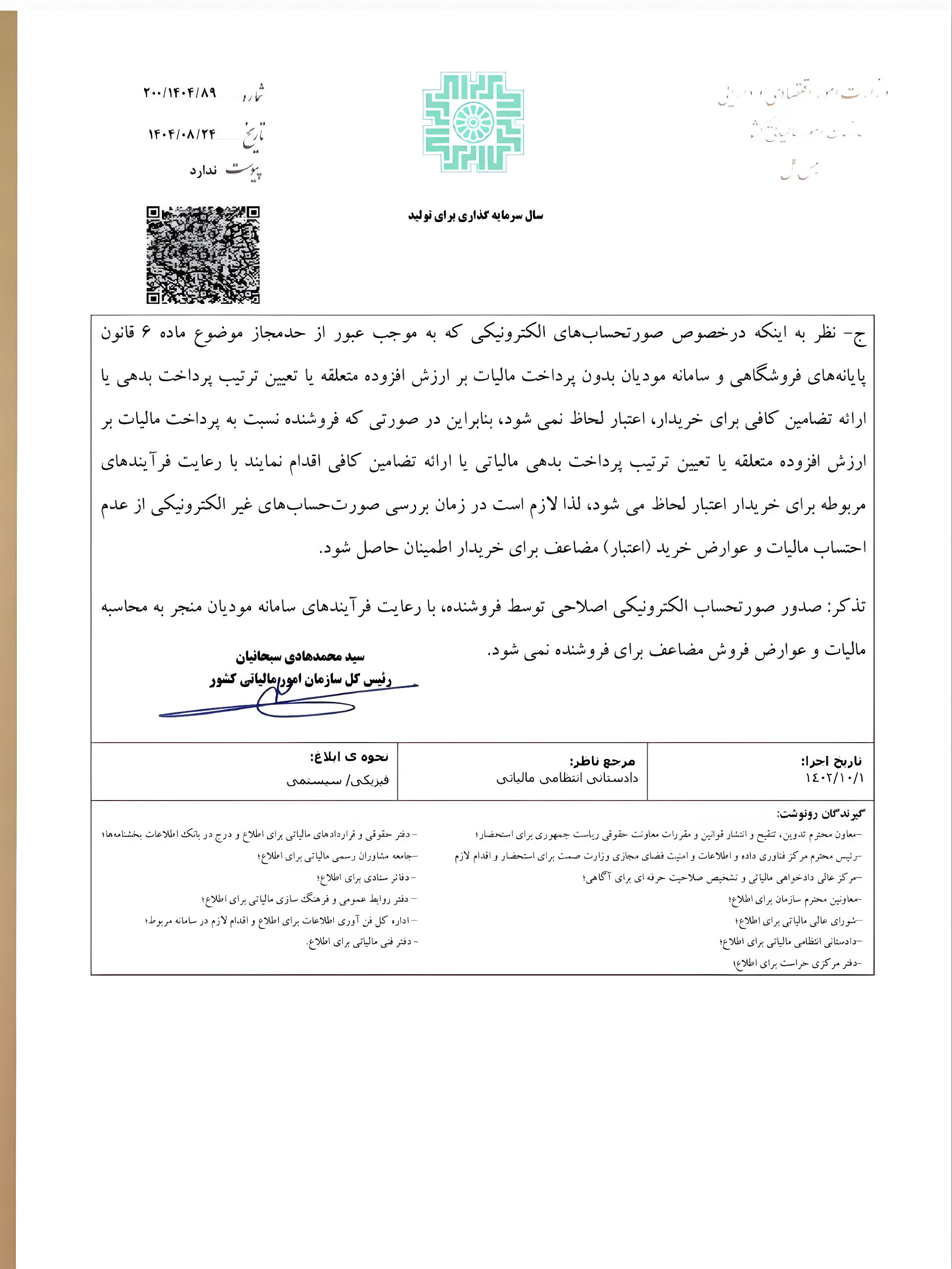 طبق بخشنامه شماره ۸۴/۱۴۰۴/۲۰۰ مورخ 07/08/1404 و در اجرای ماده (۱۴) مکرر قانون پایانههای فروشگاهی و …
