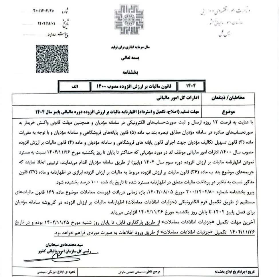 بر اساس بخشنامه مالیاتی شماره ۲۰۰/۱۴۰۴/۱۱۰ به تاریخ ۱ بهمن ۱۴۰۴، مهلت تسلیم (اصلاح، تکمیل و استرداد) اظهارنامه مالیات بر ارزش افزوده مربوط به دوره مالیاتی پاییز سال ۱۴۰۴ تمدید شد.